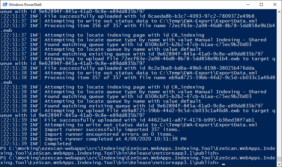 CODE.\EzeScan.WebApps.Indexing.Tool.exe export --ewa-dir "C:\EzeScanWebApps"- Confirm you see a success message at the end of the export. "Export runner successfully exported xxx items"