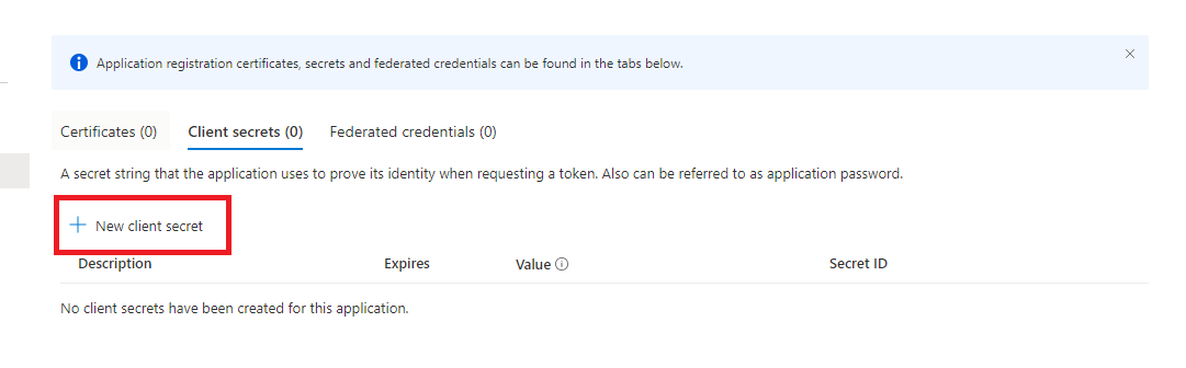 Client secret values cannot be viewed, except for immediately after creation. Be sure to save the secret when created before leaving the page.