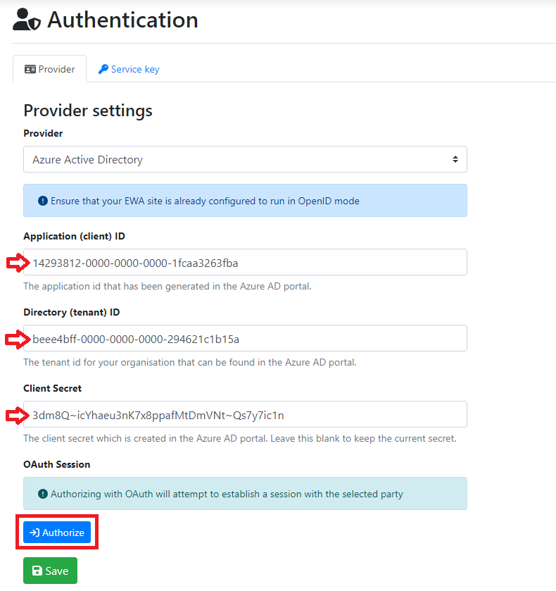 Option Value Application (client) ID The application id that has been generated in the Azure AD portal. Directory (tenant) ID The tenant id for your organisation that can be found in the Azure AD portal. Client Secret The client secret which is created in the Azure AD portal. Leave this blank to keep the current secret.