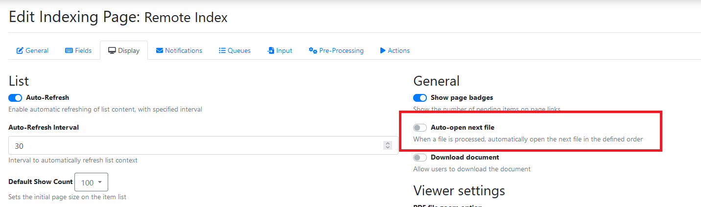 Post Action Redirect | Once the action is performed this will dictate how the user is redirected. Page default Use the Auto-open next file setting configured on the Display tab of the indexing page. ![]() Reload same item After clicking the button a user will be redirected to a processing screen that will display the processing status and then redirect the user back to the item once processing is complete. If the item is no longer available (because it has been indexed or moved to a queue the user doesn't have access to) then they user is redirected back to the list of items.
