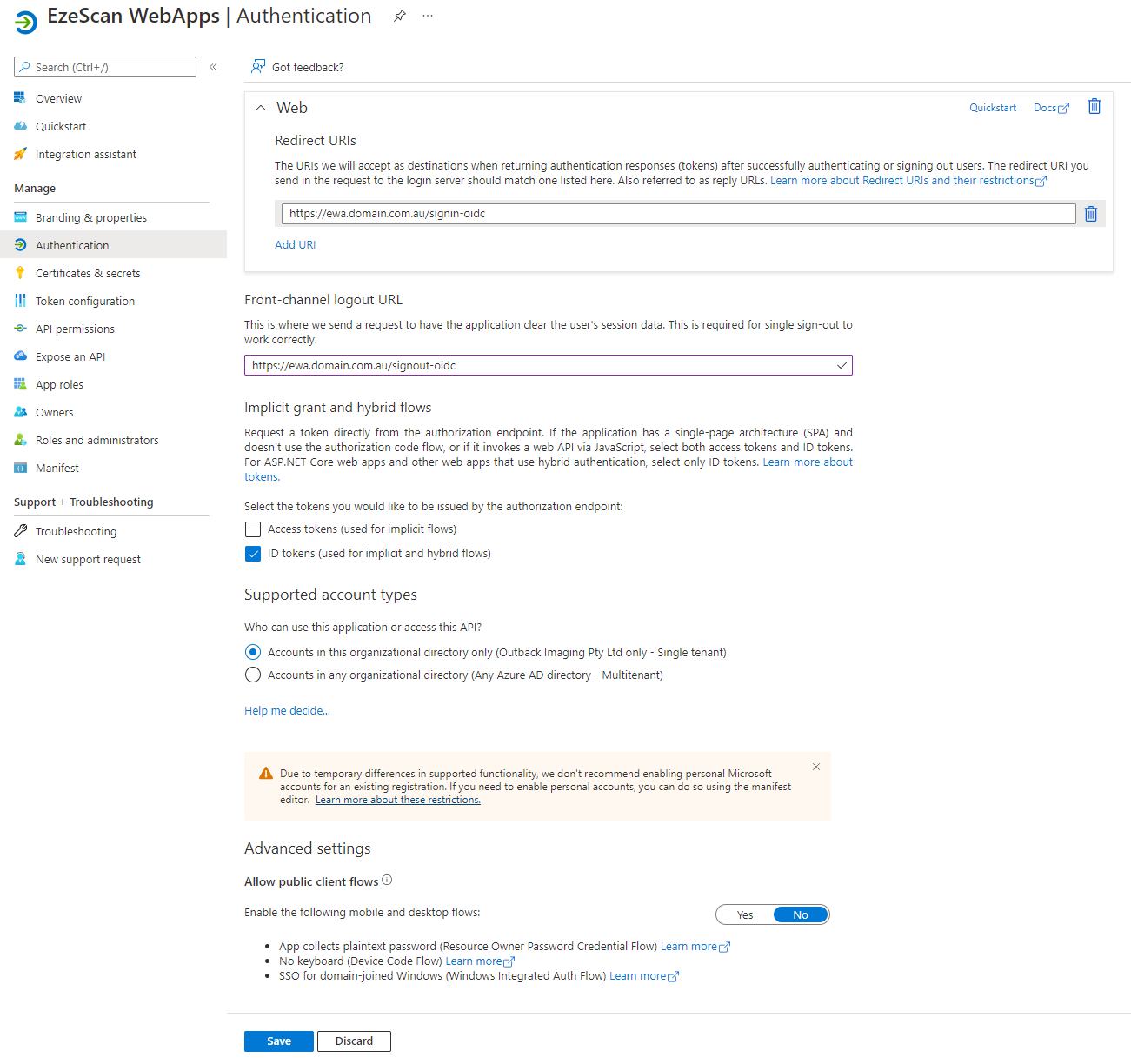 Option Value Logout Url https://ewa.domain.com/signout-oidc (Sub in the URL of your EWA install). Implicit Grant ID tokens Supported Account Types > Who can use this application or access this API? Accounts in this organizational directory only ([Your tenant name here] only - Single tenant) Advanced Settings > Allow public client flows No