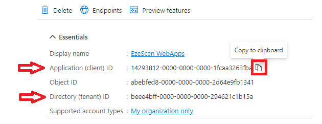 - Take note of the Application (client) ID and the Directory (tenant) ID by mousing over then clicking the copy to clipboard button and saving them somewhere safe for later use.