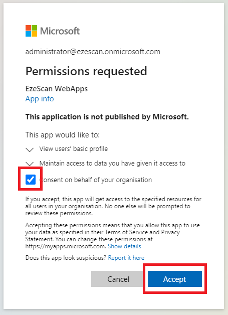 - Login as an Azure AD Administrator, tick the Consent box and then click Accept.