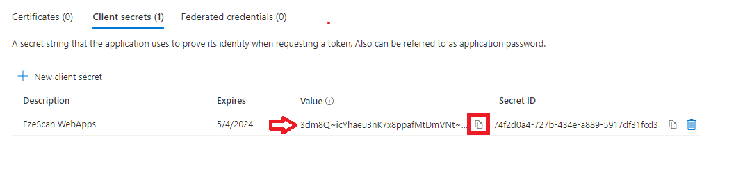 Take note of the Value of the client secret by clicking the copy to clipboard button and saving it somewhere safe for later use.