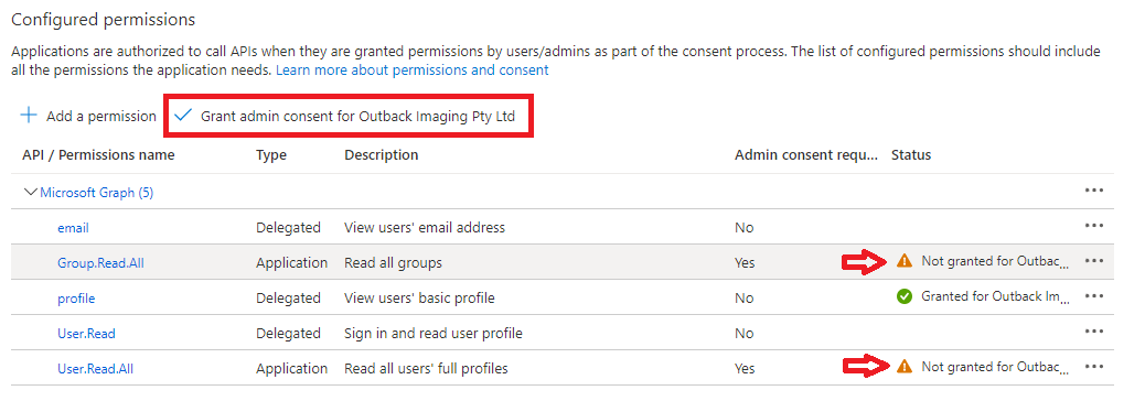 - Notice that the newly added permissions have not been granted consent yet. Click the Grant admin consent for COMPANY NAME option.