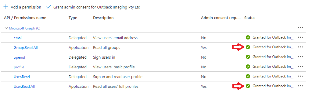 - Confirm that the consent has been added for the Group.Read.All and User.Read.All permissions.