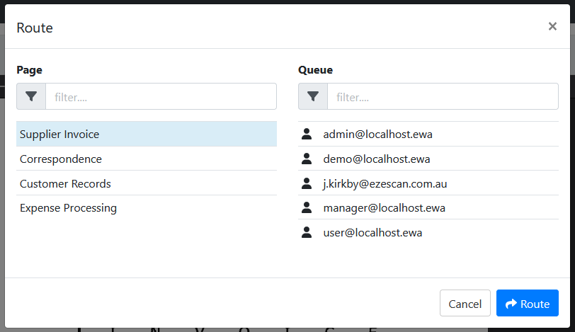 The queue selection frontend allows a user to select a target page and queue.