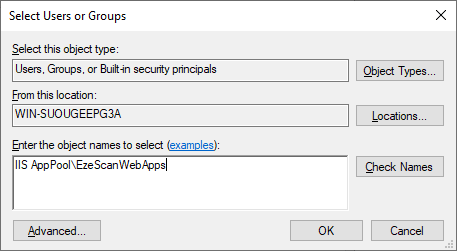 - Enter IIS AppPool\EzeScanWebApps and click the Check Names button.