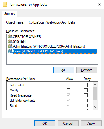 EzeScan WebApps application pool’s identity needs to have read/write access to the App_Data folder in order to move files around and function correctly.