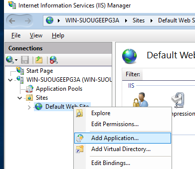 - Right click Default Web Site and then click Add Application.
