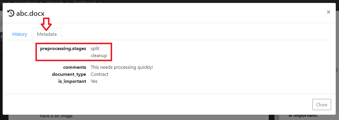 Short Name | This field provides unique identification for the stage. If an item has already executed a pre-processor with the same short name then the stage will be skipped. This field is commonly used in combination with the Run pre-processors option. For example say you have two indexing pages with the following pre-processors configured: Correspondence Invoices If an invoice incorrectly arrived into the correspondence page then it would fire off and run the Document Split and Clean-up pre-processors on the item. ![]() When a user then routes the item to the correct Invoices page we want to ensure it triggers the pre-processing again. ![]() But this time because the short names are the exact same the item will actually skip the first two stages and jump straight to the Extract Invoice Data stage. ![]() You can see which stages (that have short names configured) have been already run on the item by opening the history for an item and looking at the Metadata tab. ![]() |