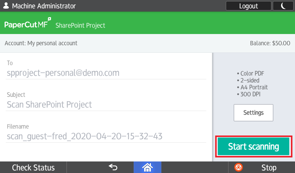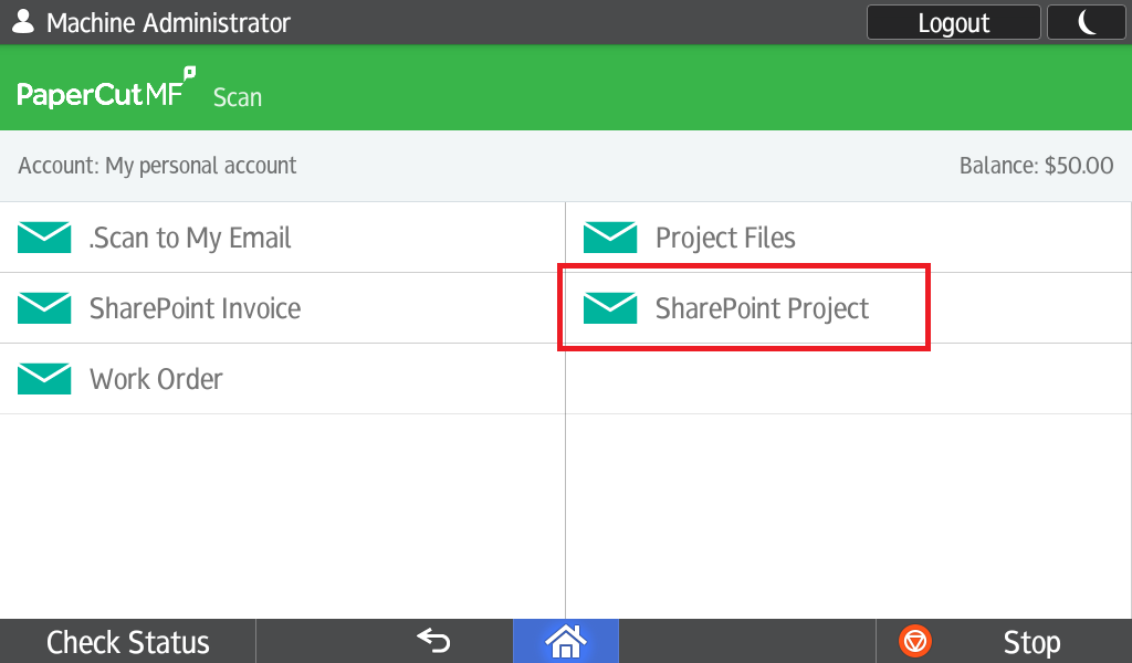 - If you now log into a device that is running the PaperCut MF application you should see your new button!