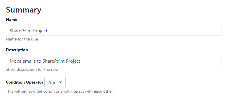 Option Value Name SharePoint Project Description Move emails to SharePoint Project Conditional Operator And