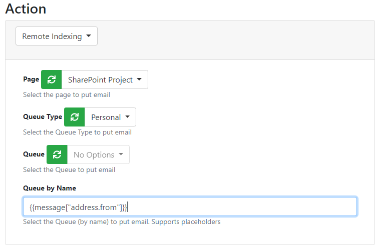 In summary this rule takes any attachments that are sent to spproject@demo.com and then puts them into the sending users personal queue (which is found via the from address on the email) on the the SharePoint Project indexing page.