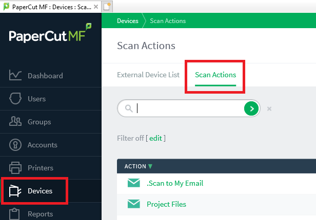- Open PaperCut MF Admin then Select Devices on the left menu and then the Scan Actions tab.