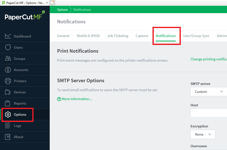- Open PaperCut MF admin then select Options on the left menu and then the Notifications tab.