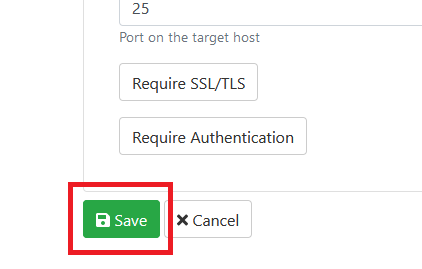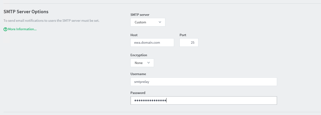 Option Value SMTP Server Custom Host (IP address or hostname of your EWA server) Port 25 Encryption None Username smtprelay Password (Password you set in the first part of this guide on the EWA SMTP server)