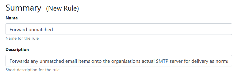 Option Value Name Forward unmatched Description Forwards any unmatched email items onto the organisations actual SMTP server for delivery as normal. Conditional Operator And