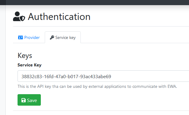 - Select Authentication on the left menu and then note the configured Service Key value which can be found on the Service Key tab.