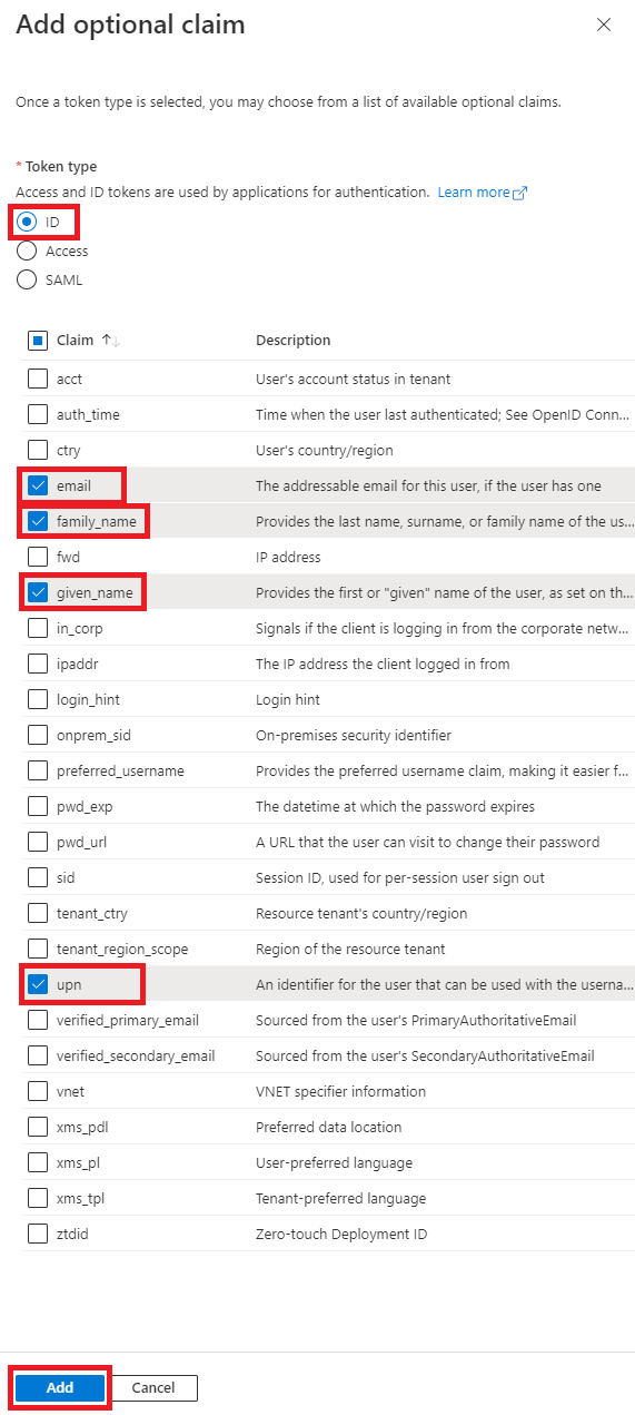 - Select the Token Type: ID, then tick the options to enable email, upn, family_name and given_name. Click the Add button.