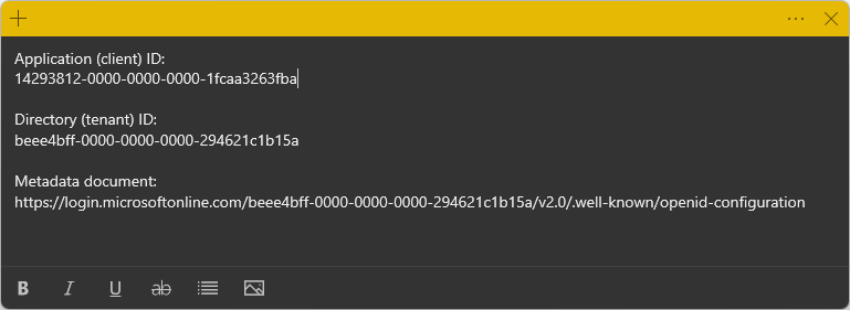- Take note of the Application (client) ID and the Directory (tenant) ID by mousing over then clicking the copy to clipboard button and saving them somewhere safe for later use.