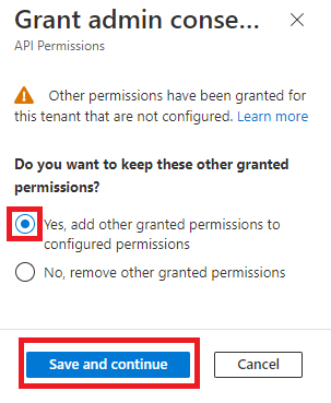 - Select the Yes, add other granted permissions to the configured permissions option and click Save and Continue.