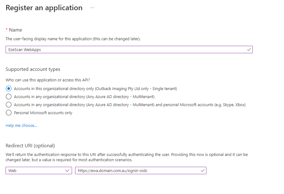 Option Value Name EzeScan WebApps Supported account types Accounts in this organizational directory only ([Your tenant name here] only - Single tenant)