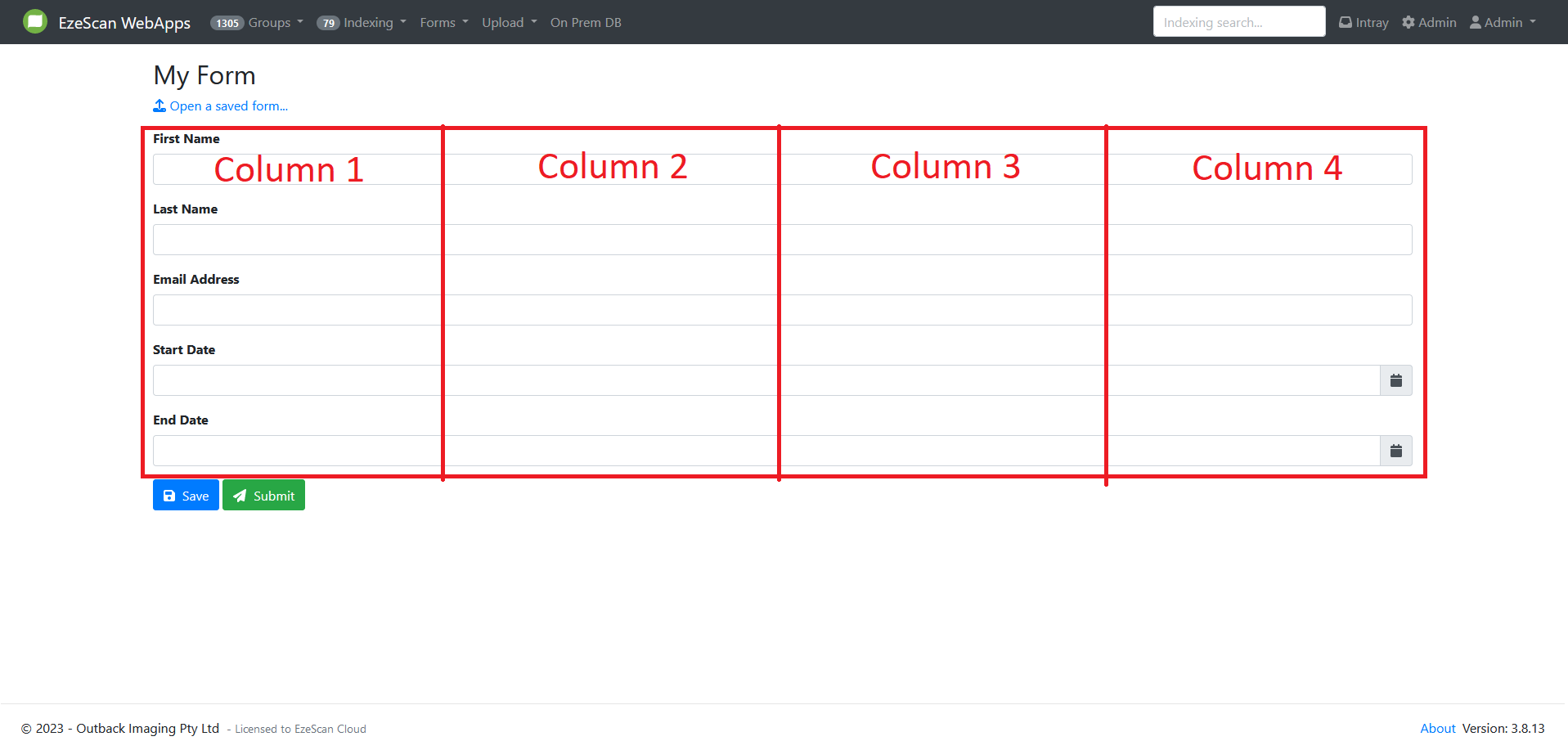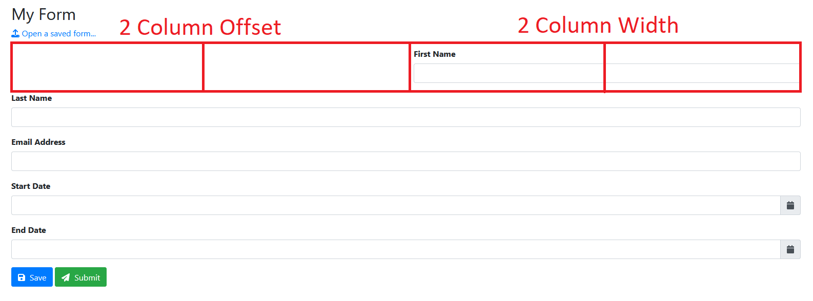 Column Offset | This setting allows you to set how many columns this field should be offset from the left. For example setting a field to 2 column offset and then 2 column width would make it half the size of the area and right align it. ![]() ![]() |