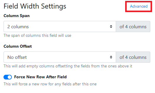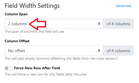 Column Span | By default the area where fields are rendered is broken up into 4 columns. ![]() This setting allows you to set how many columns this field should span. Be default it is set to “Full Width” which is equivalent to 4 columns. For example setting this to 2 columns would make the field occupy half of the width. ![]() ![]() |