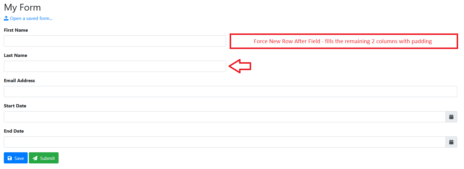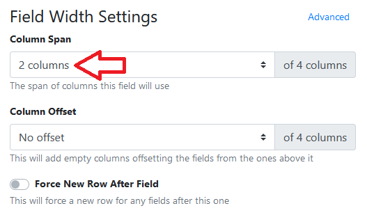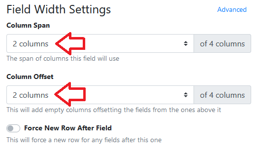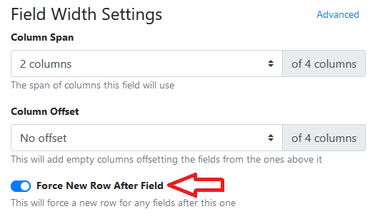 Force New Row After Field | This setting adds padding to any columns that would be “empty” to the right of the field. For example say you had 2 fields each configured with 2 column width then they would display on the same line. ![]() ![]() By enabling this option on the first field we can force the 2nd field down to the next line. ![]() ![]() |