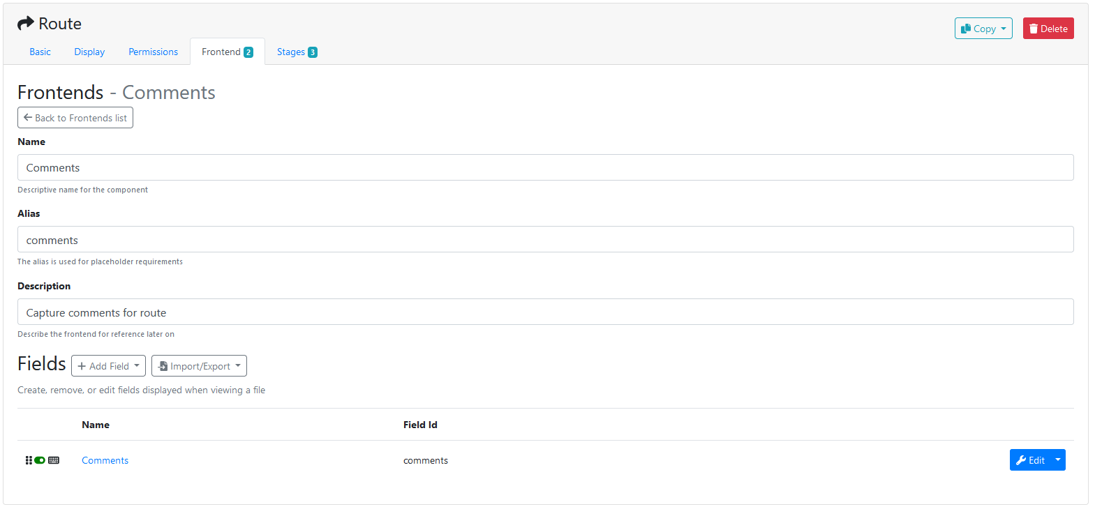 If you want to see this in action then try a creating an action from the Route template and see how the front end is used to collect comments from the user and then those comments are used in the route to queue stage to populate the comments.