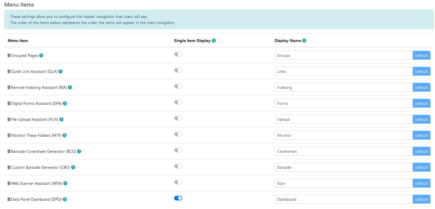 Allows configuration of the built in menu items.