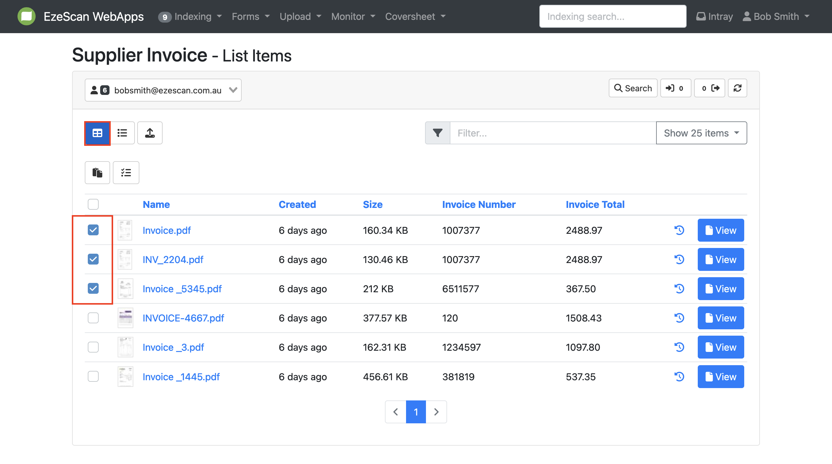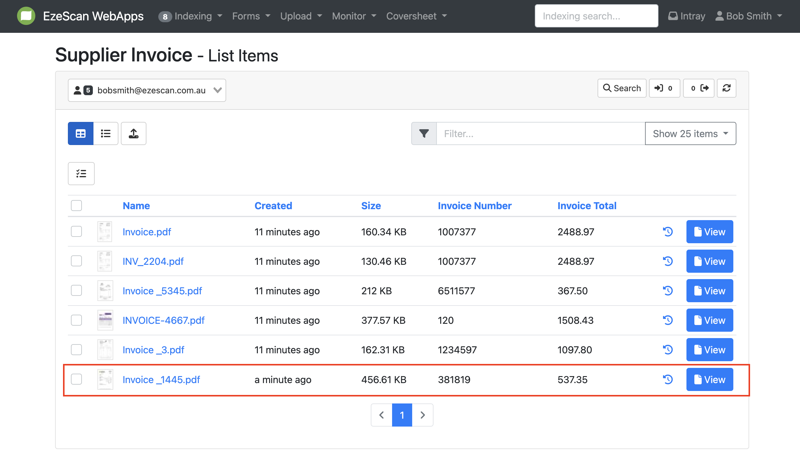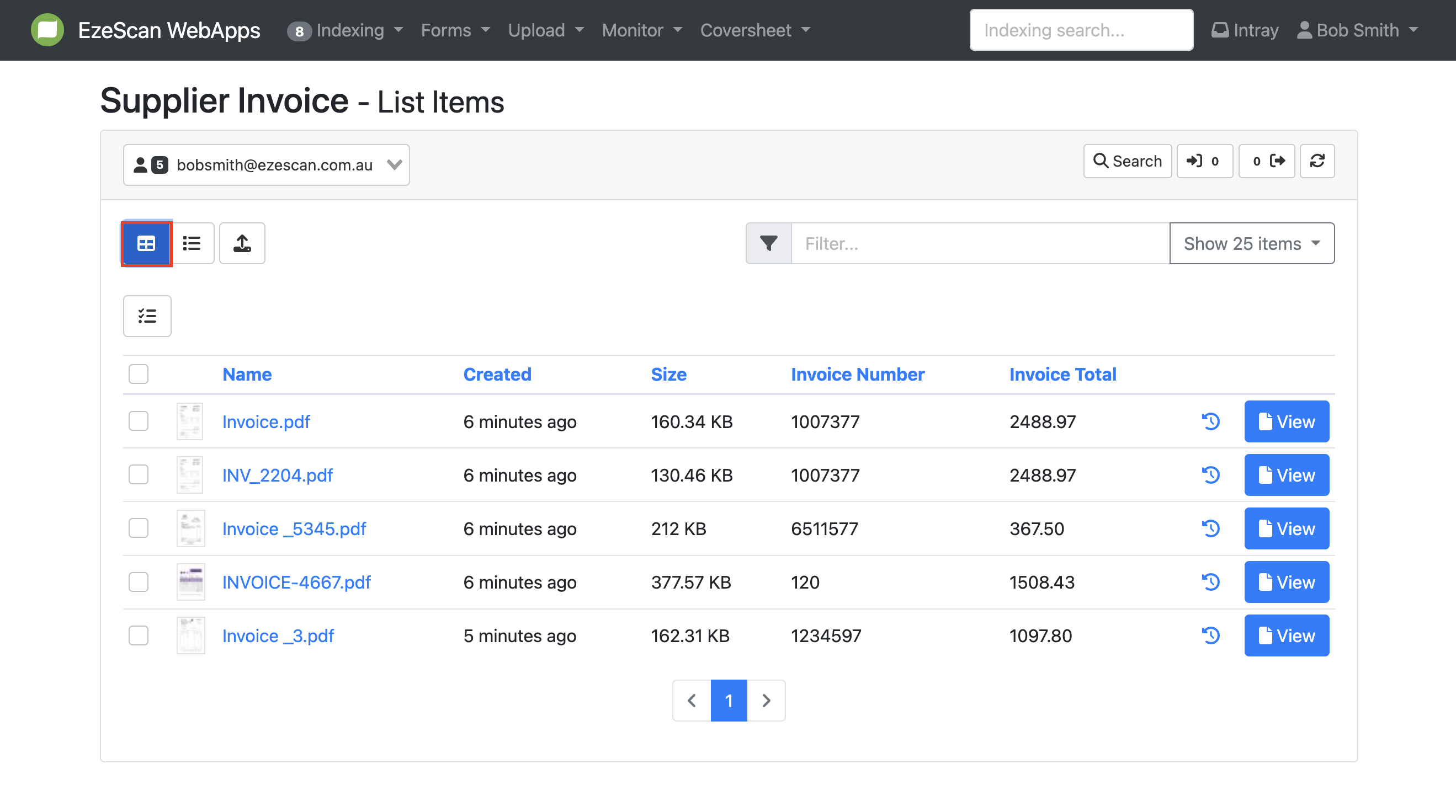 Within each queue, the table and list square icon buttons towards the top left of the table give you two view options to swap between. The list view shown below provides a larger thumbnail and can display metadata for each document. This view is particularly useful when processing invoices with pre-extracted metadata.