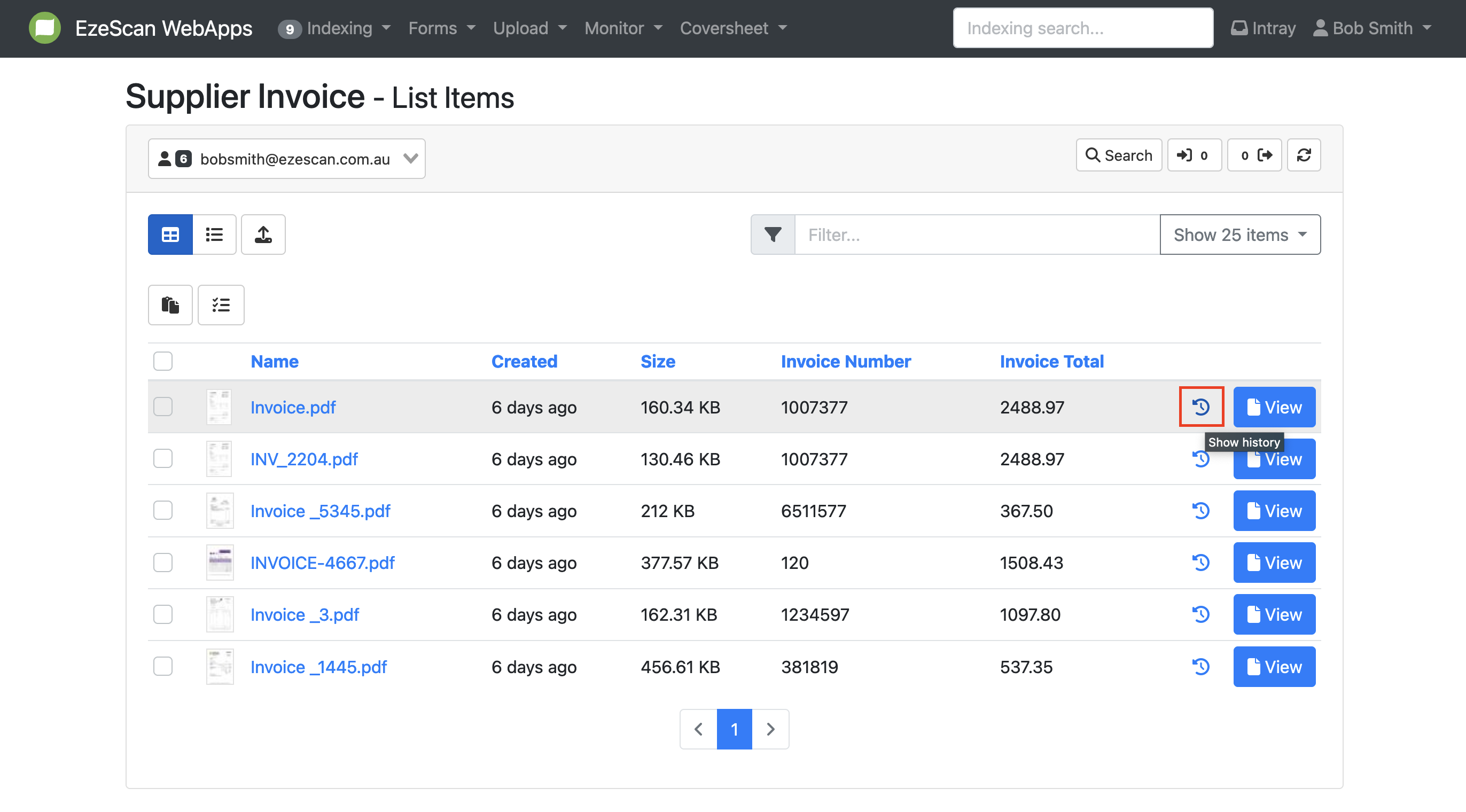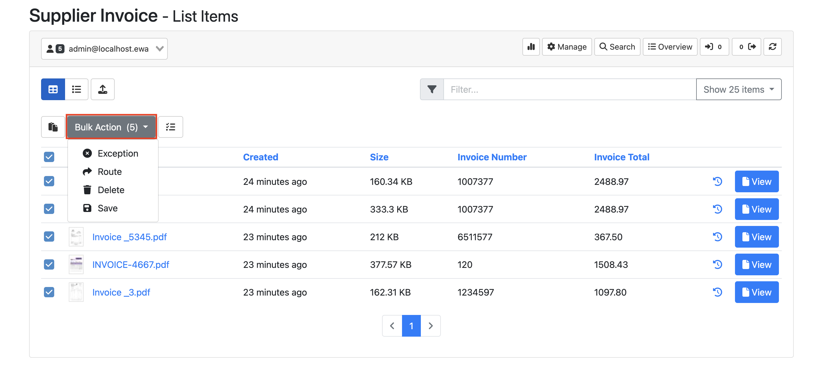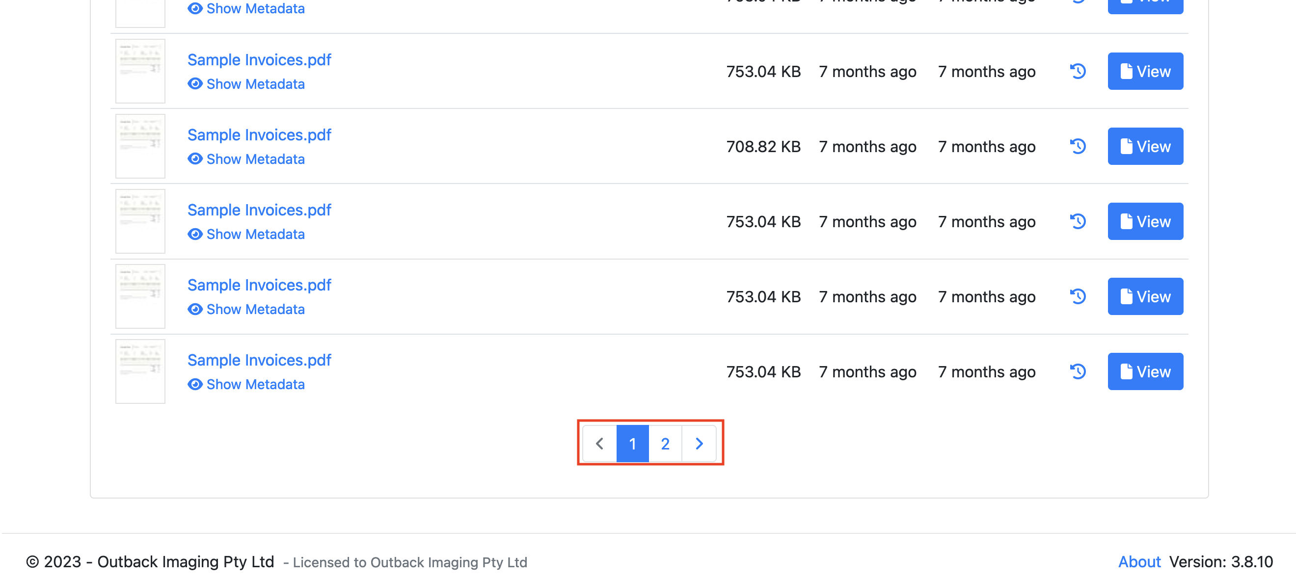 Within each queue, the table and list square icon buttons towards the top left of the table give you two view options to swap between. The list view shown below provides a larger thumbnail and can display metadata for each document. This view is particularly useful when processing invoices with pre-extracted metadata.