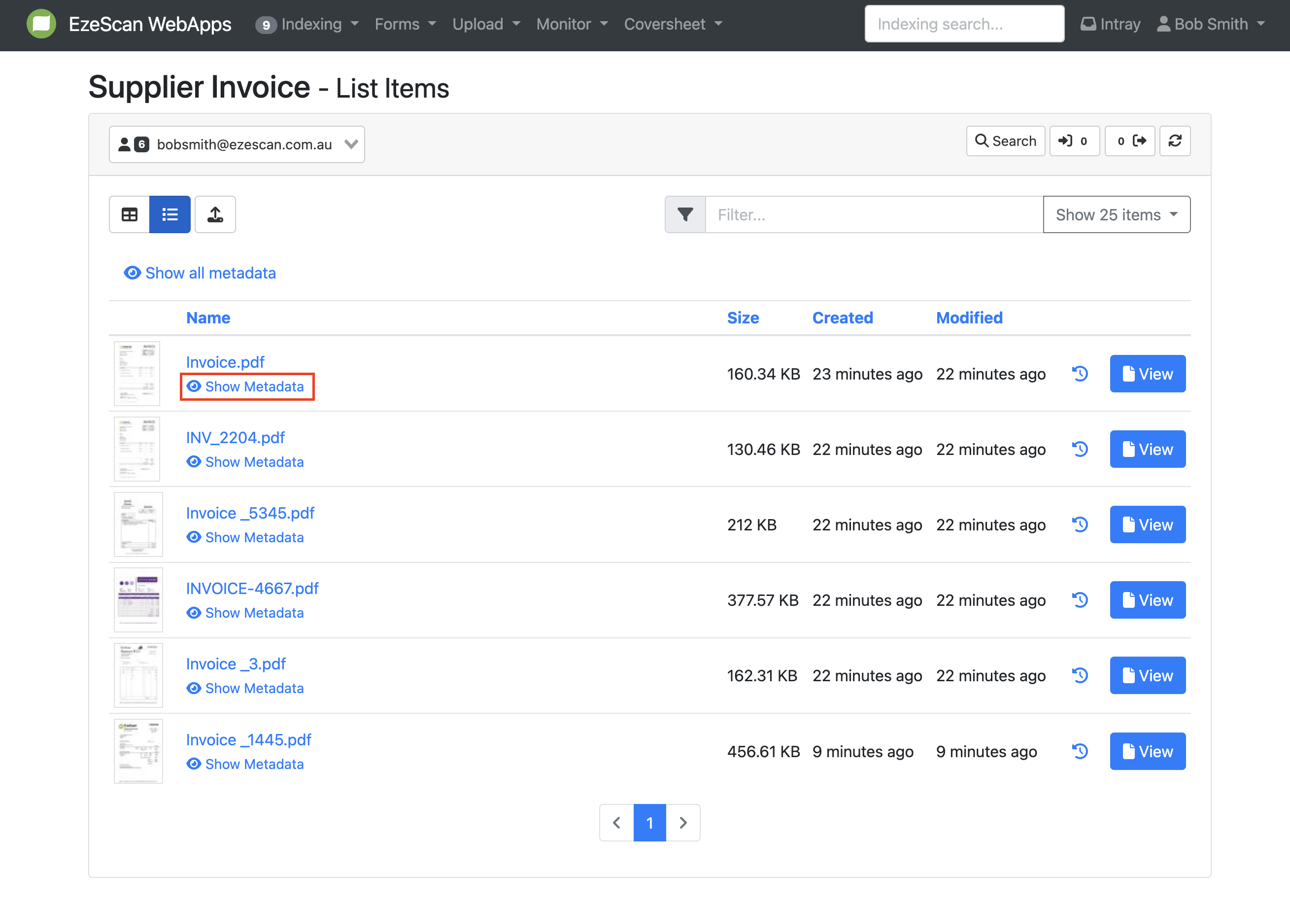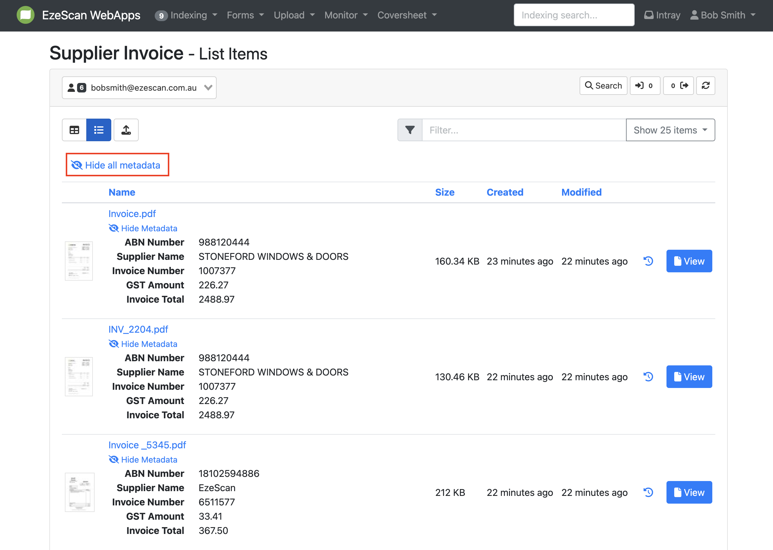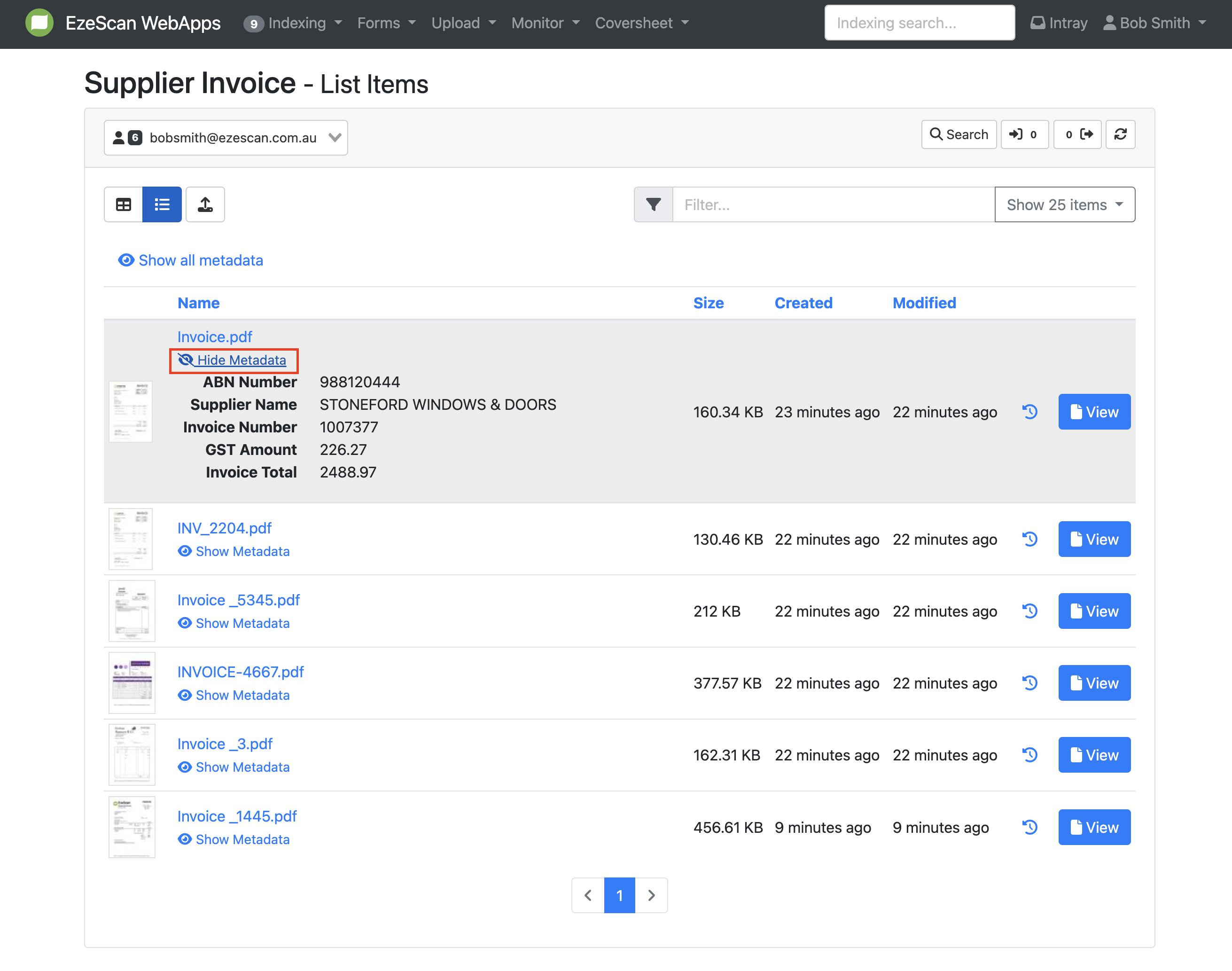 EzeScan will display the extracted metadata specifically for that document. To hide this metadata, click the "Hide Metadata" text.