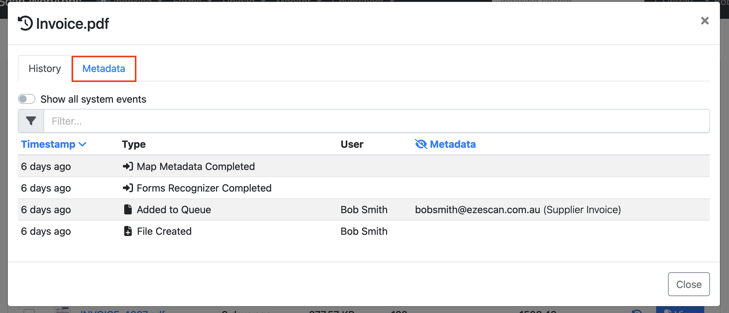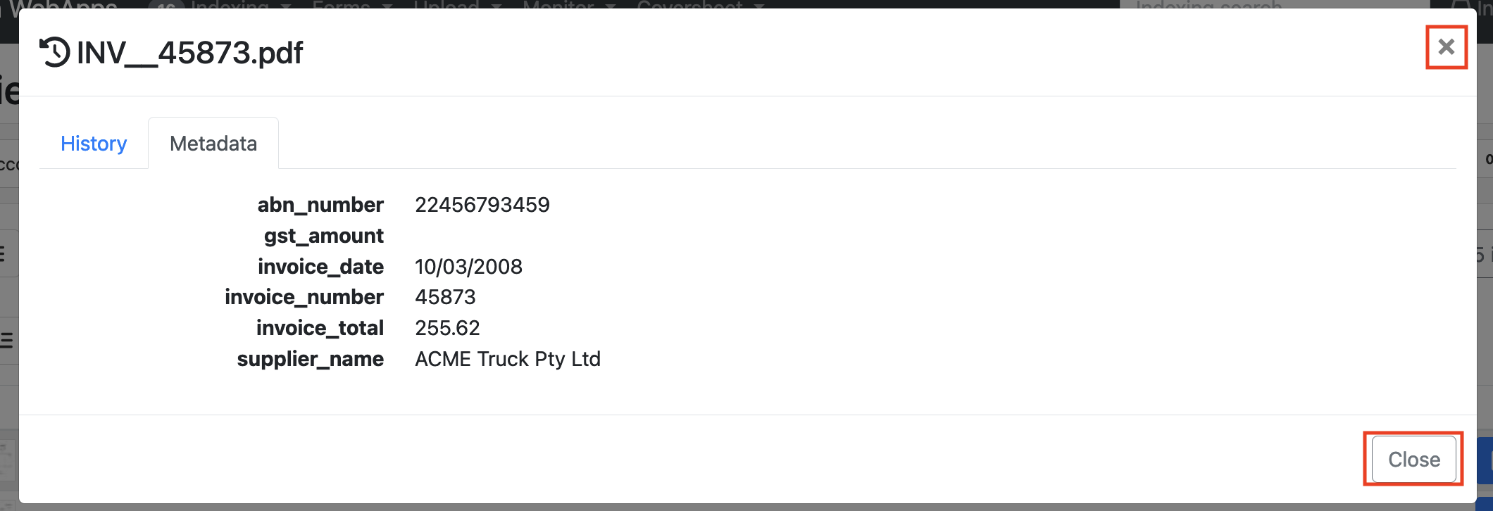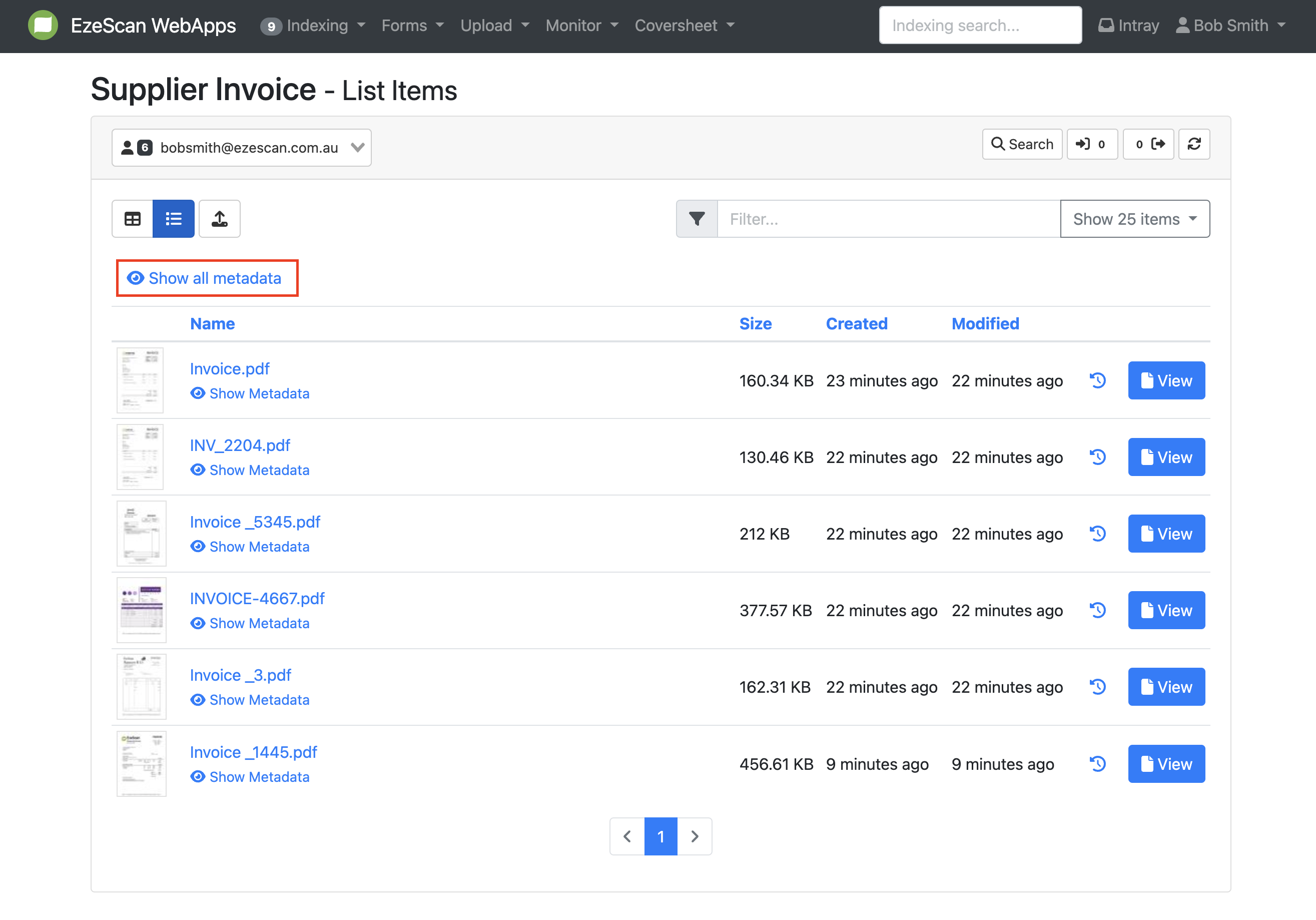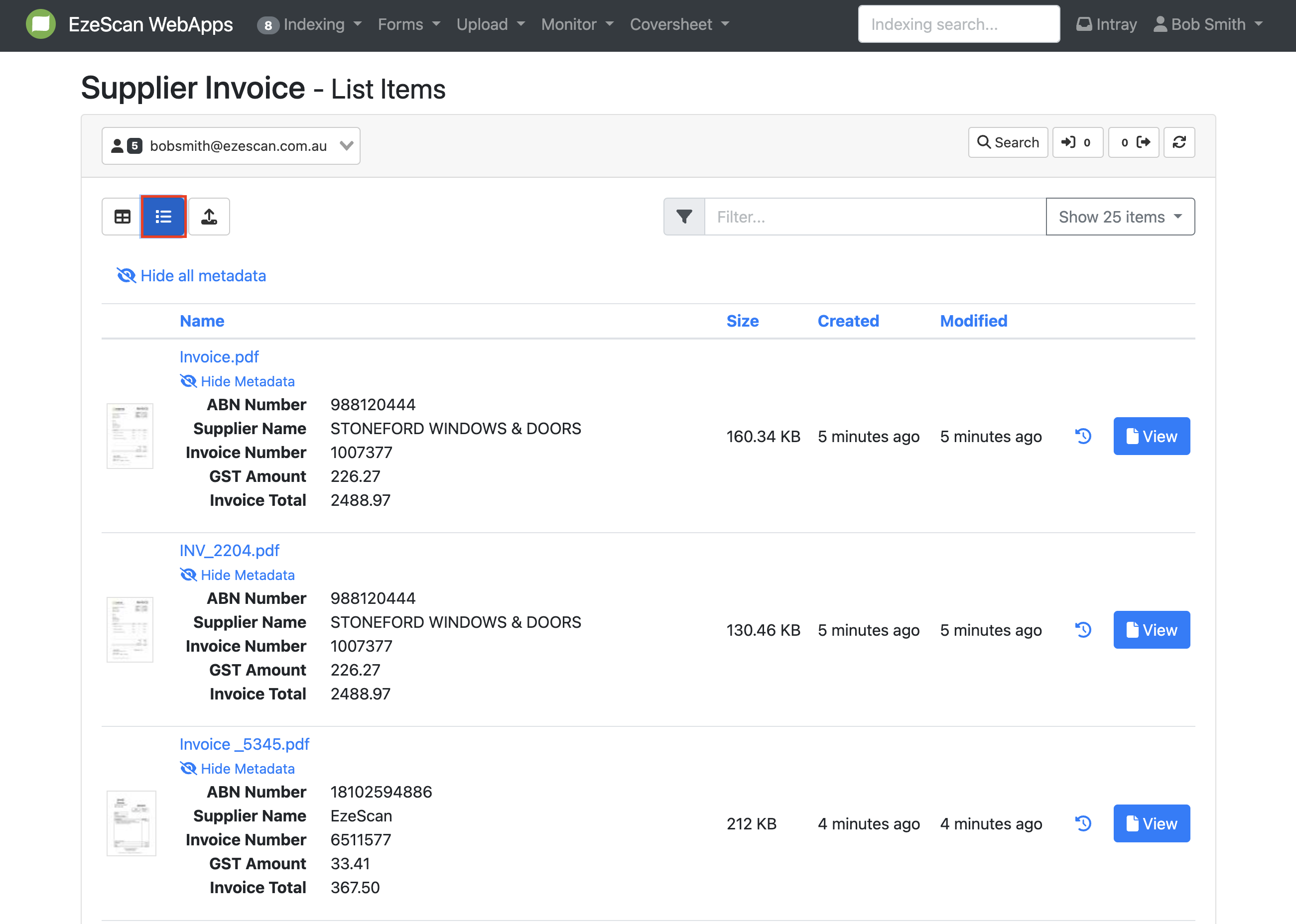 EzeScan will display the extracted metadata specifically for that document. To hide this metadata, click the "Hide Metadata" text.