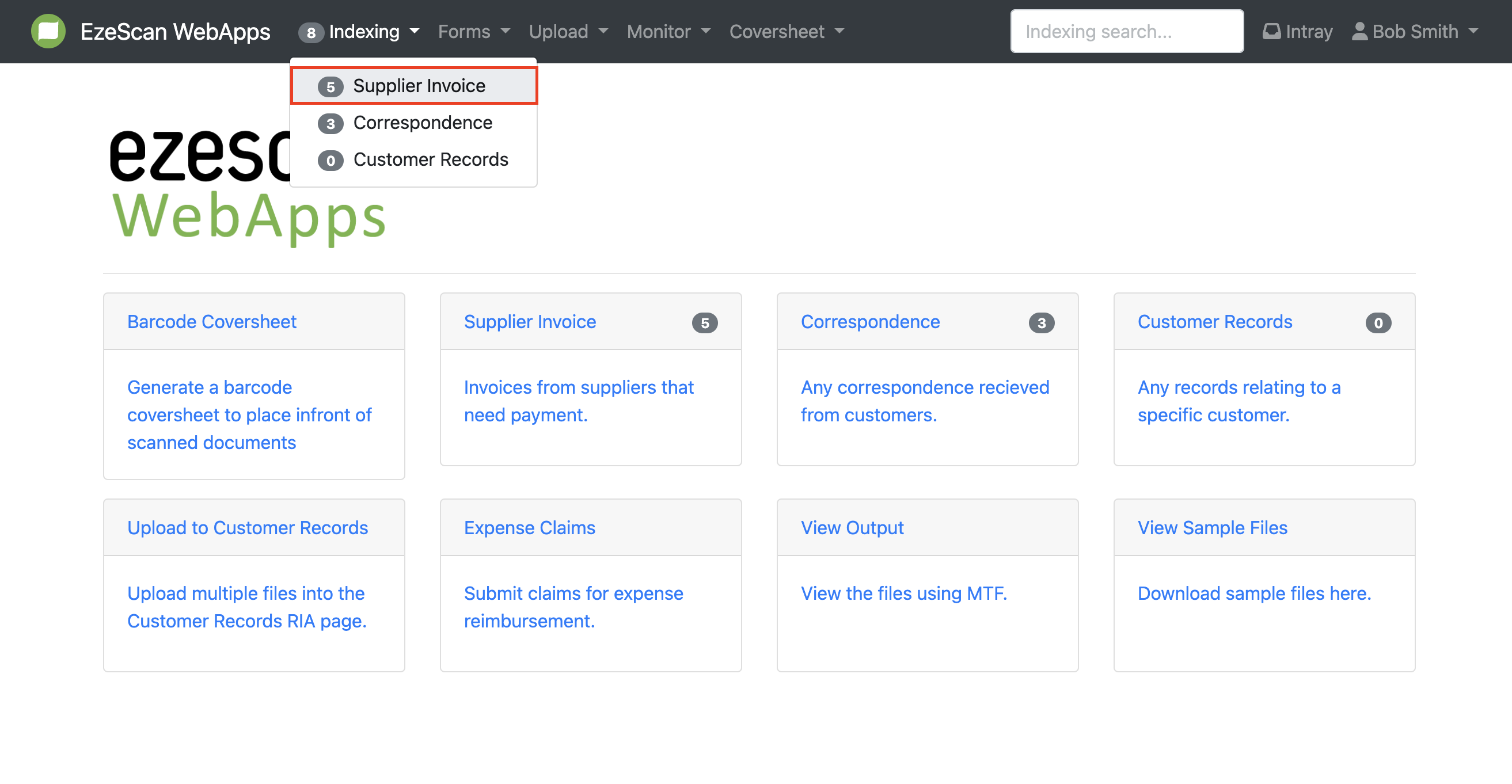 To access an app page, go to the indexing tab drop-down menu. The number next to the app page name indicates the number of documents awaiting processing in that queue. Please note that the queue names and numbers may vary based on your organisation's configuration and your user role.