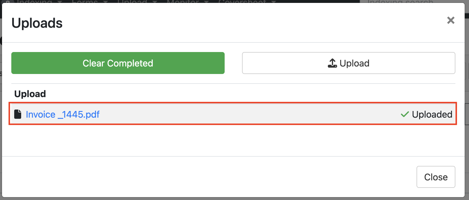 Documents that have been uploaded successfully will appear with a green tick. To remove uploaded documents, click the “Clear Completed” button. You can upload as many documents as you like before closing the window using the "x" or “close” button.