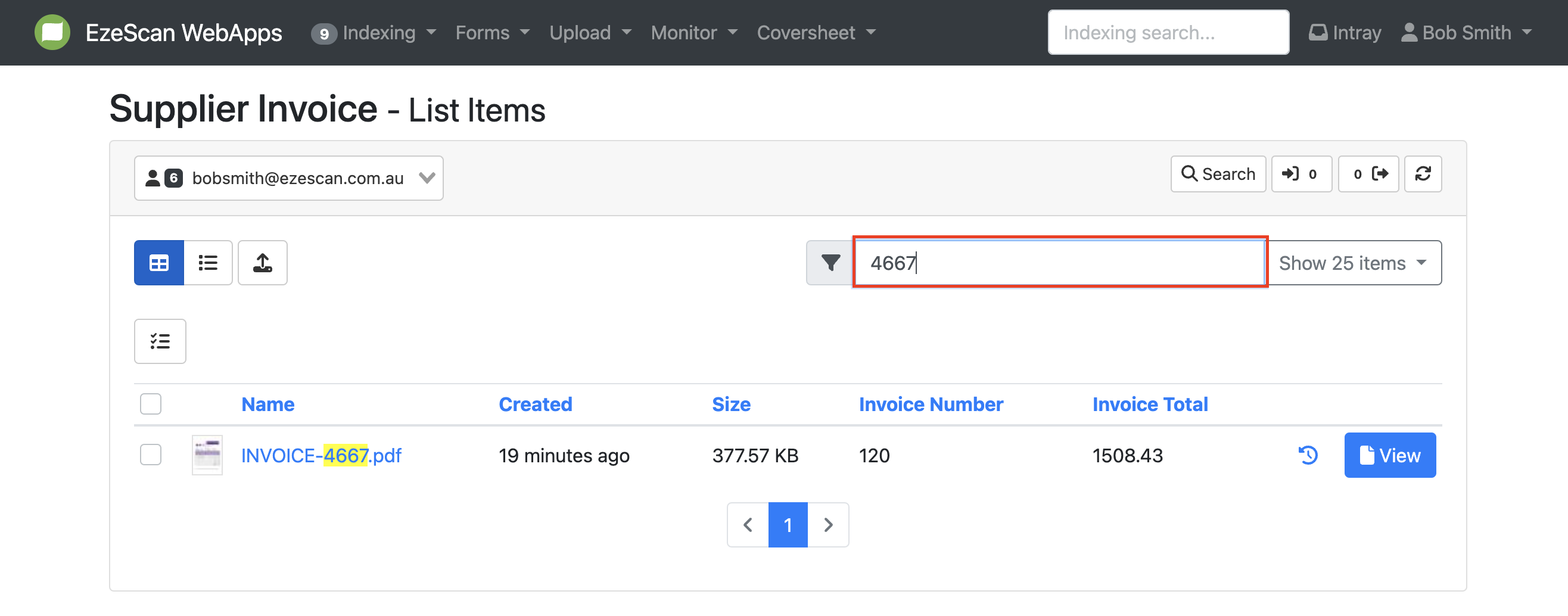 To search for specific documents in a queue, enter a search term into the filter search bar. EzeScan will display only the items that have that term in any of their metadata fields in that queue. To remove a filter, delete the text from the search box.