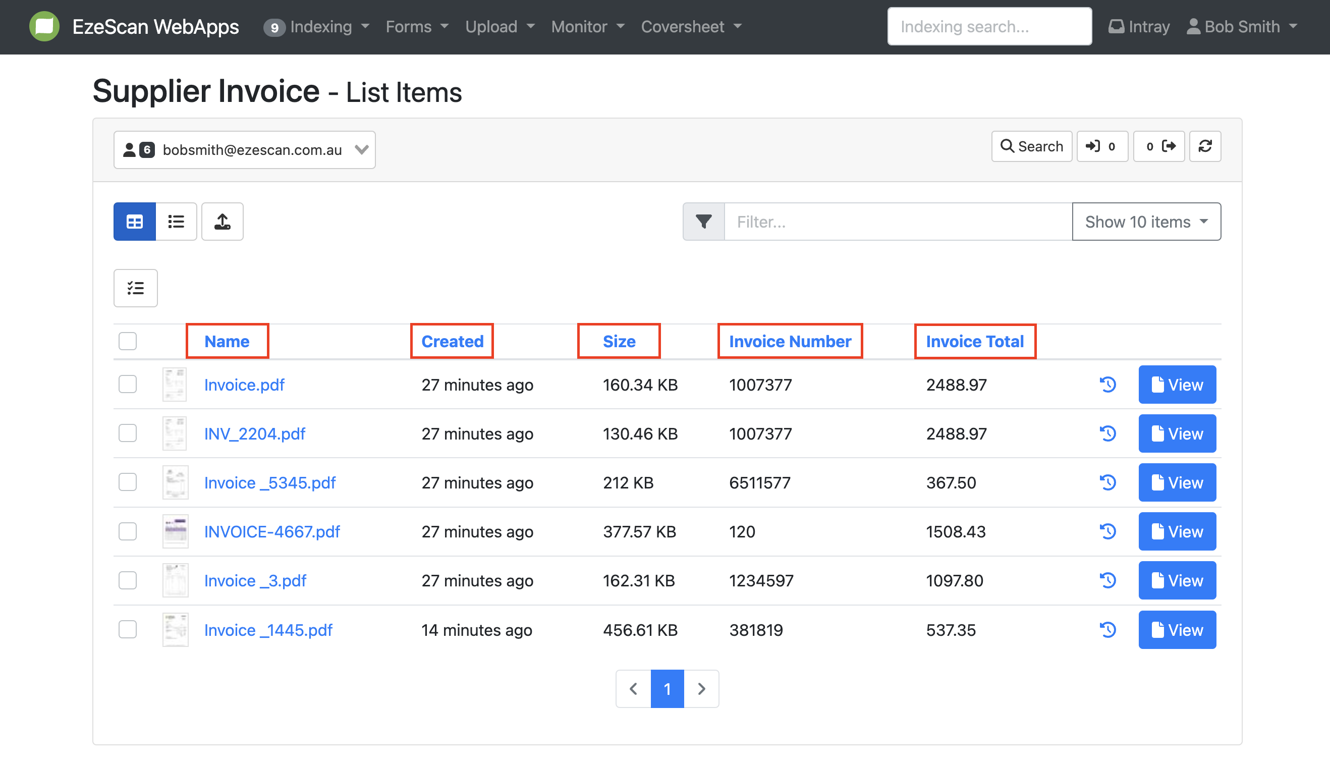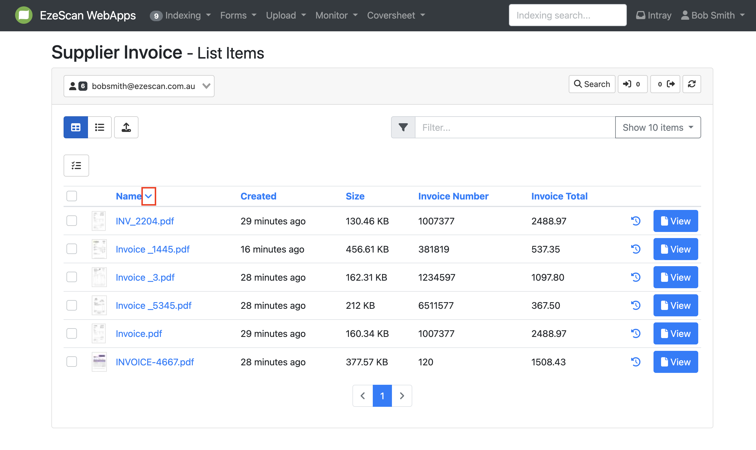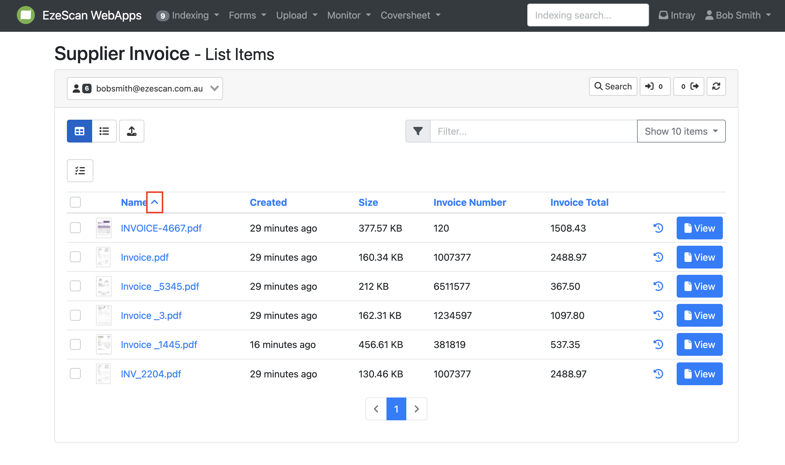 When you select a queue, EzeScan will display a list of documents within that queue or workflow that require processing. Each document will display a selection of configured fields such as a pdf thumbnail, name of document, size, and date created. Please note: these fields will vary depending on your selected workflow or organisation's configuration.