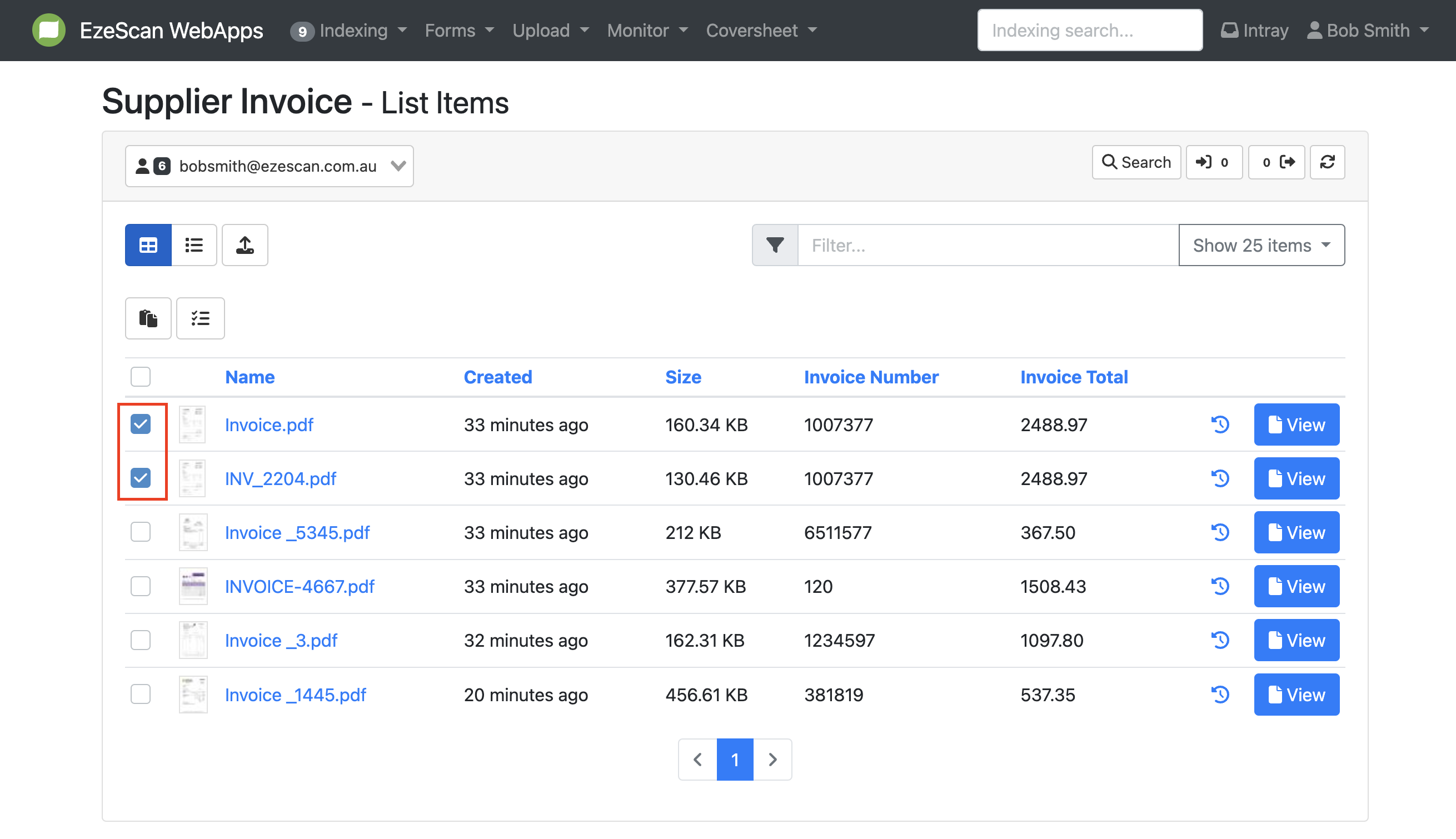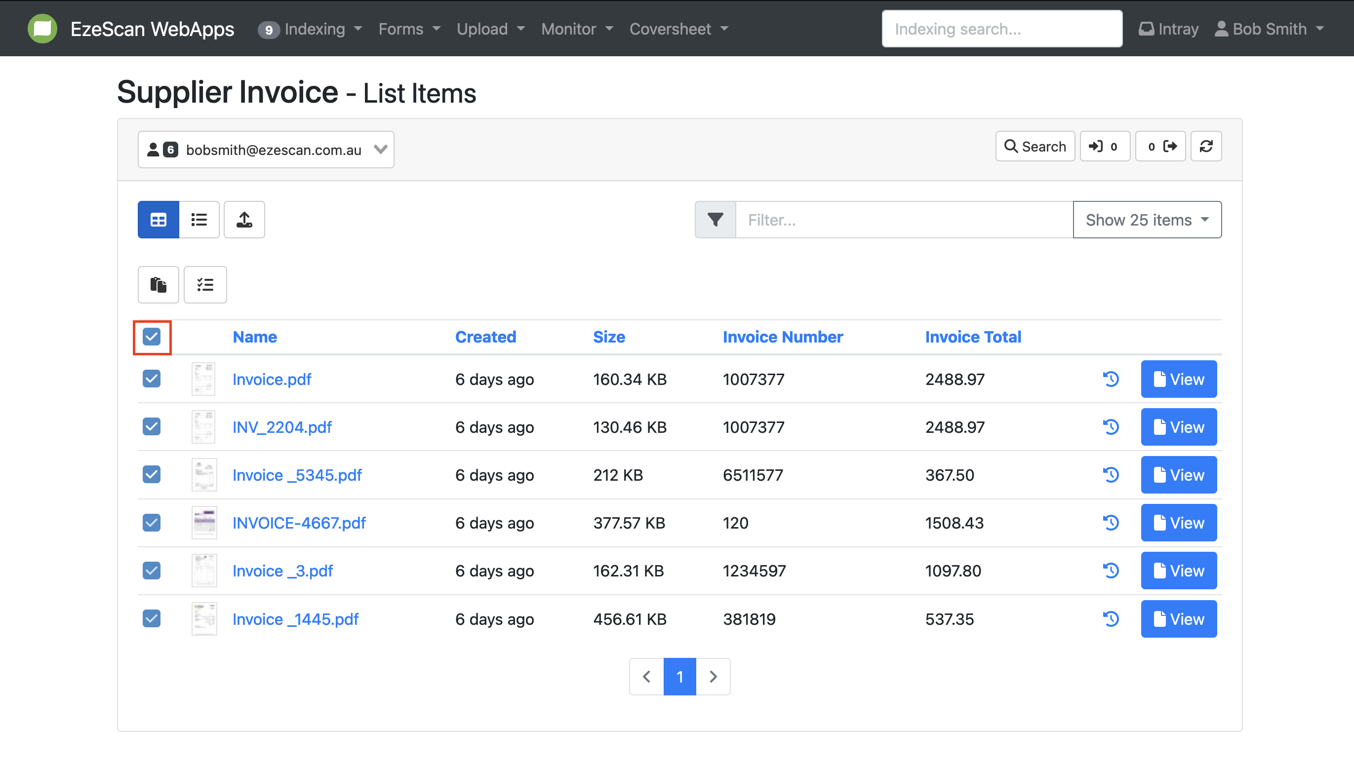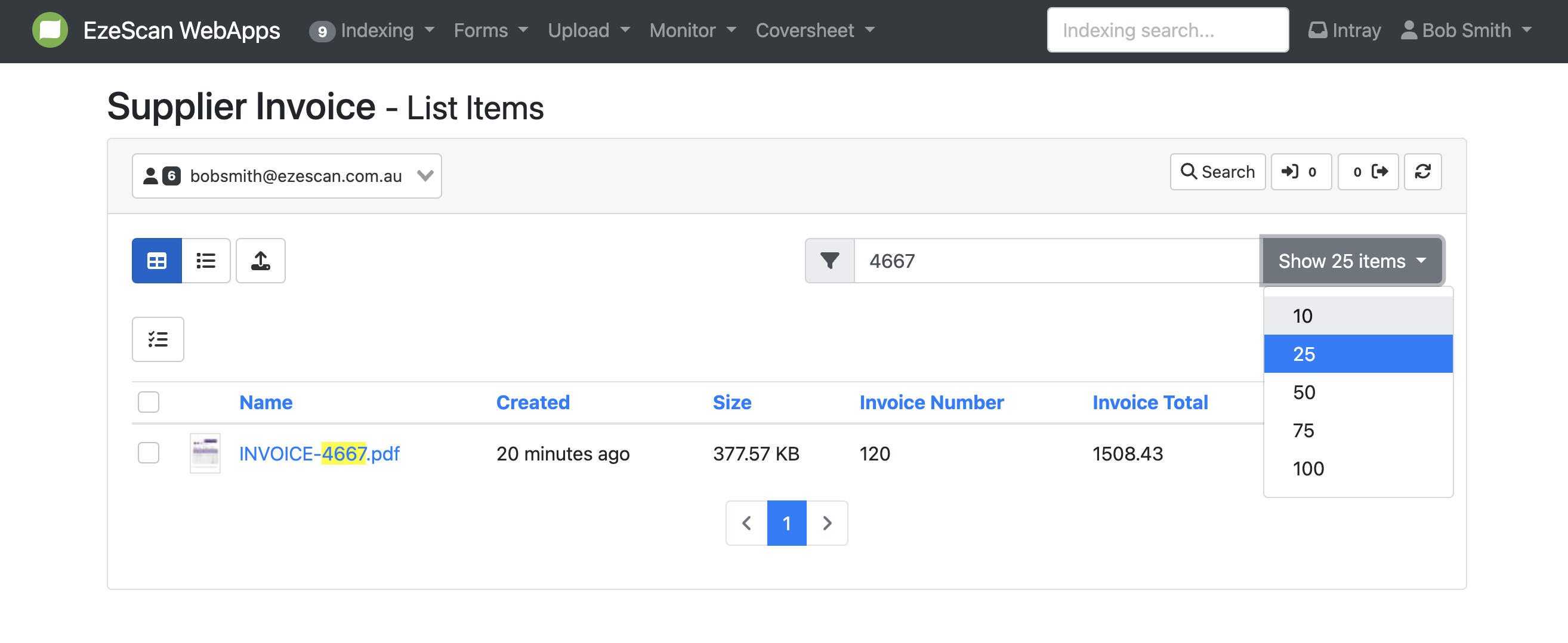 When you select a queue, EzeScan will display a list of documents within that queue or workflow that require processing. Each document will display a selection of configured fields such as a pdf thumbnail, name of document, size, and date created. Please note: these fields will vary depending on your selected workflow or organisation's configuration.