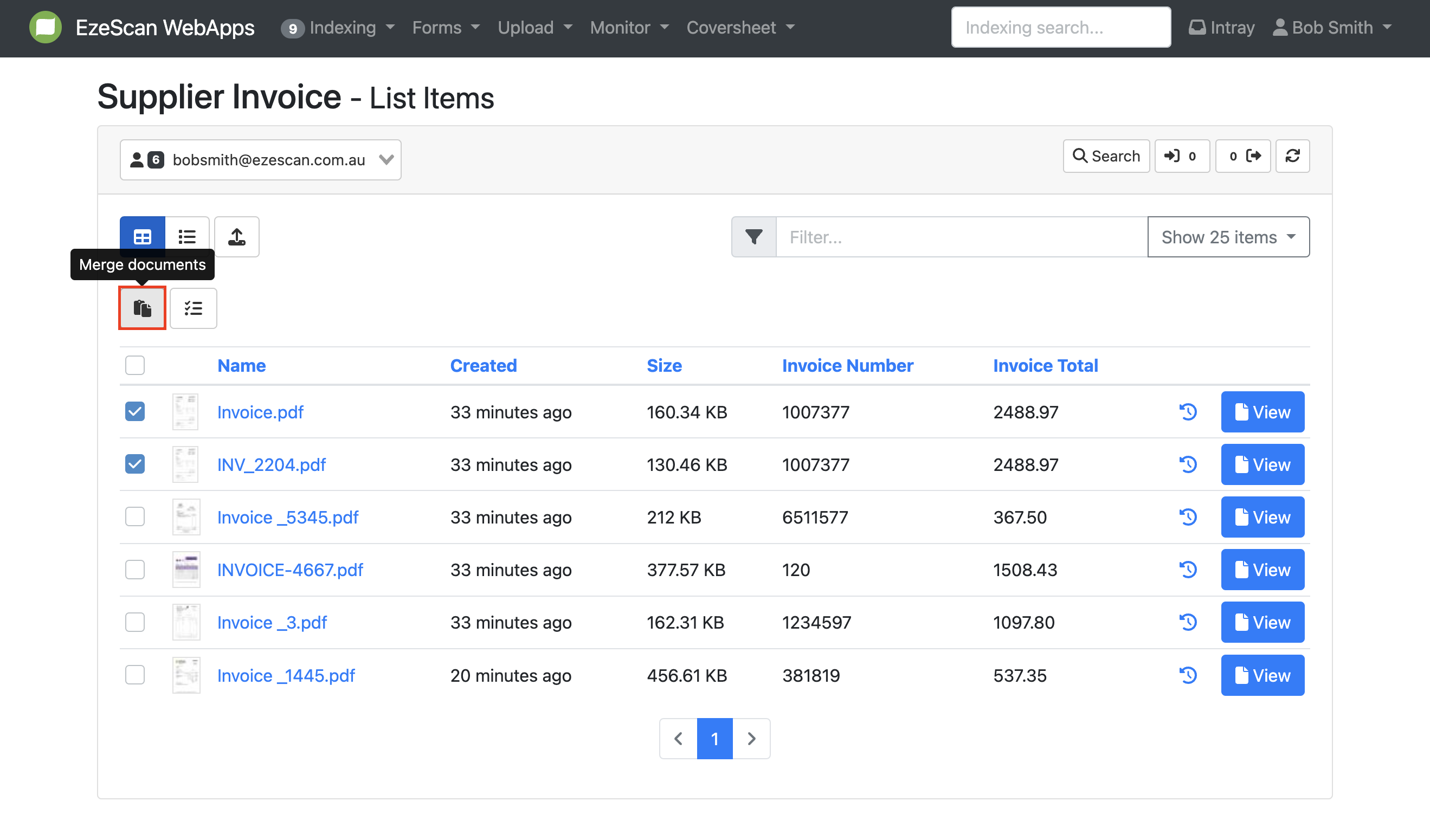 To merge document/s, select the checkbox of two or more documents that you want to merge.