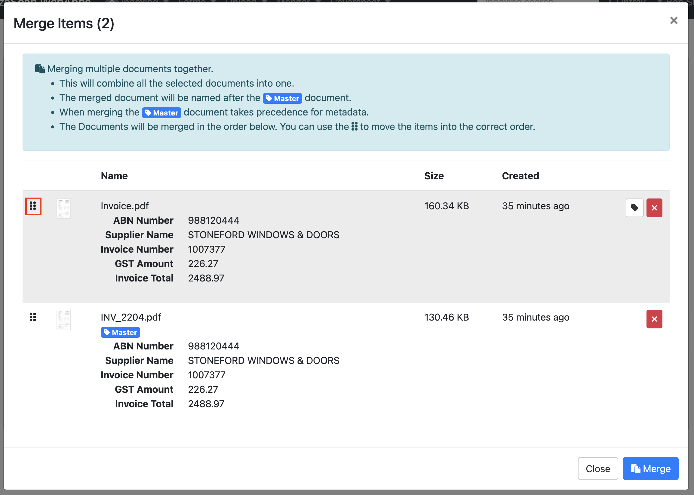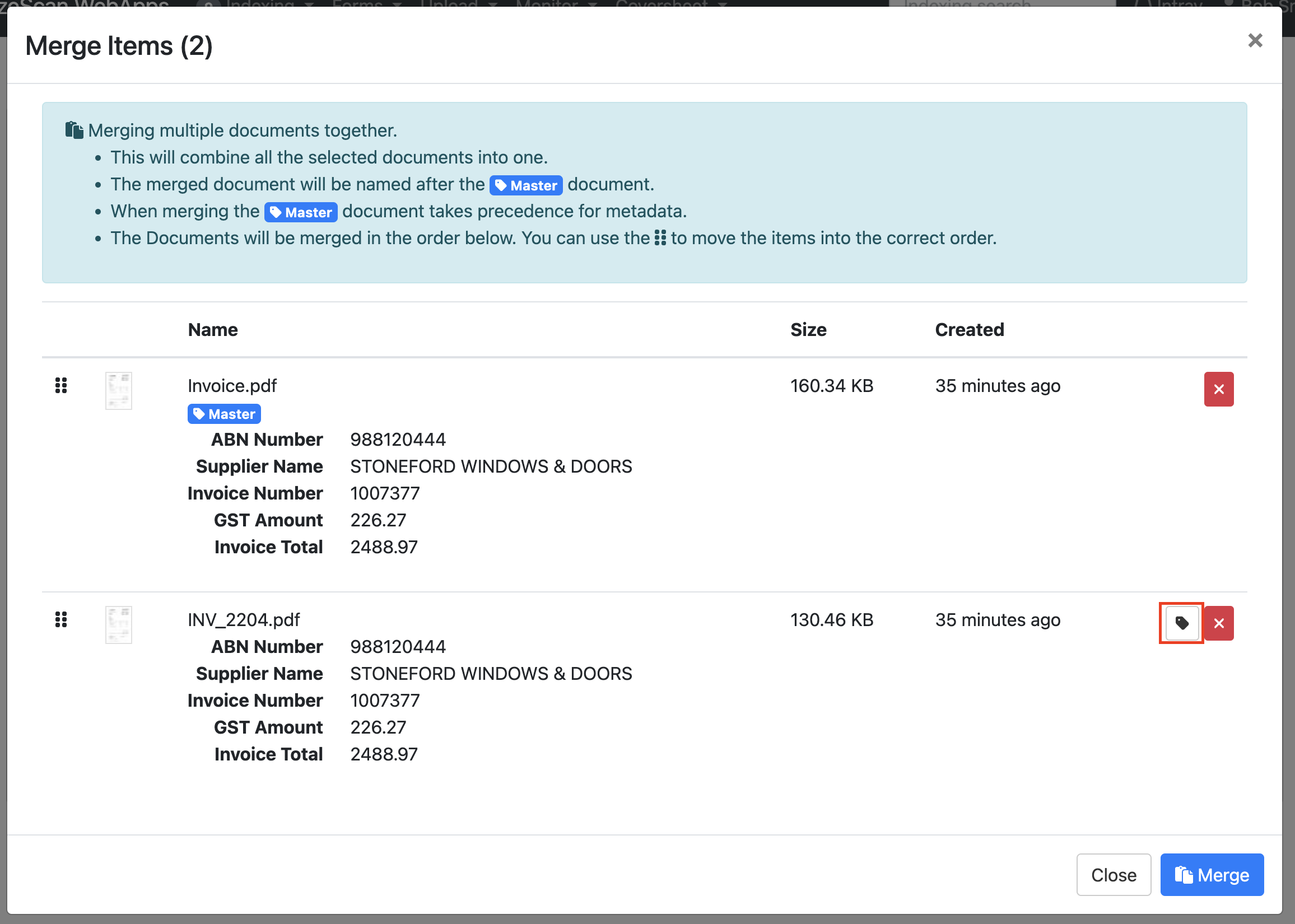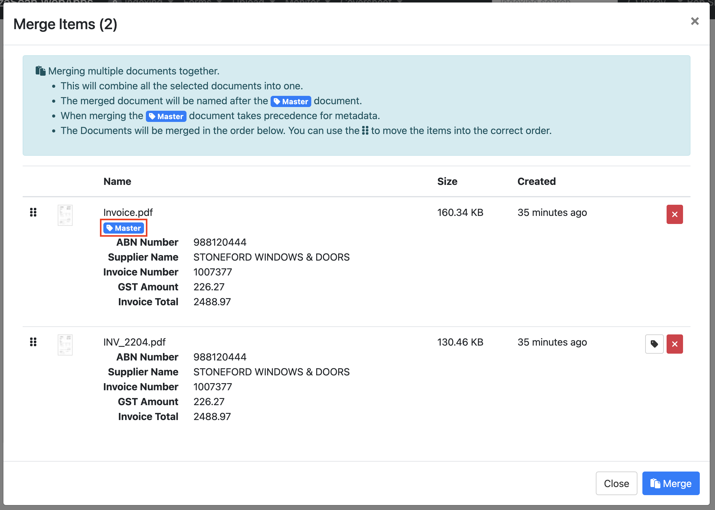 A browser will open, indicating the documents you are about to merge. A master tag will appear on the document selected as the master, from which the metadata and name will be taken.