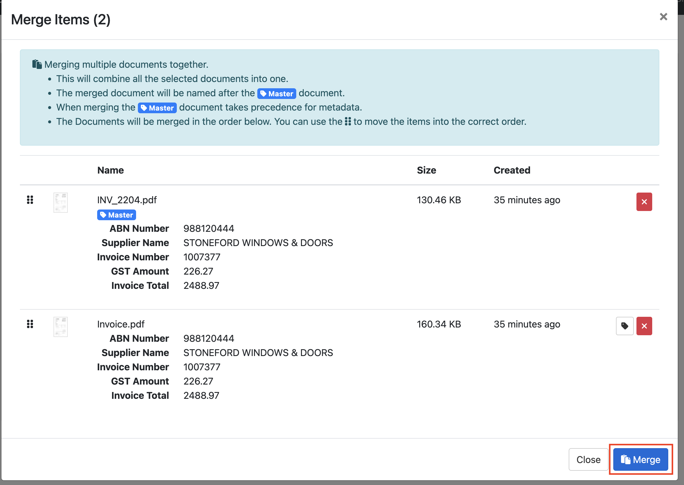 Once you're satisfied with the order and master document, click the "Merge" button.