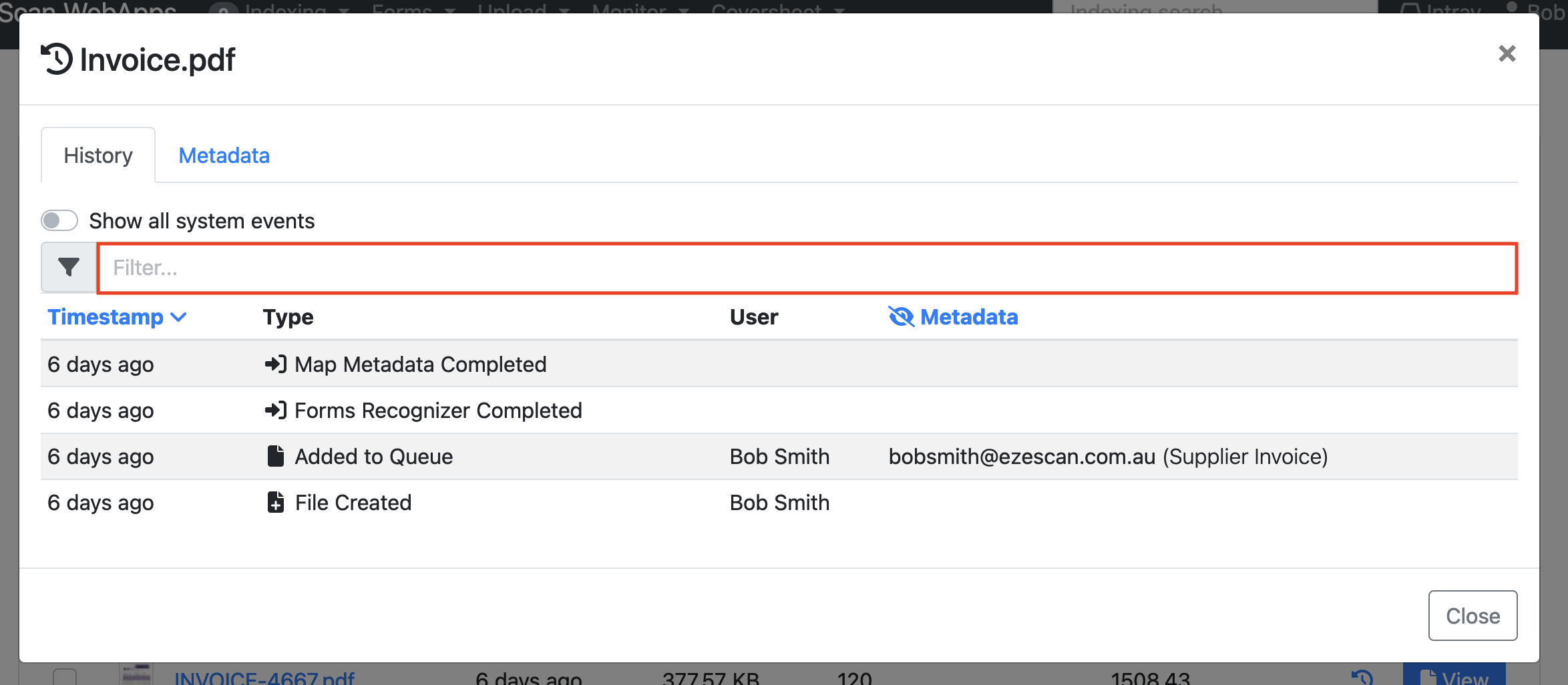 A pop-up window will appear, listing the actions taken on that document since entering Webapps and by which user. You can search this history by typing your search term into the search bar.