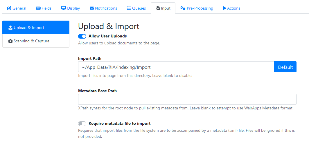 Require metadata file to import | Requires that import files from the file system are to be accompanied by a metadata (.xml) file. Files will be ignored if this is not provided. |
