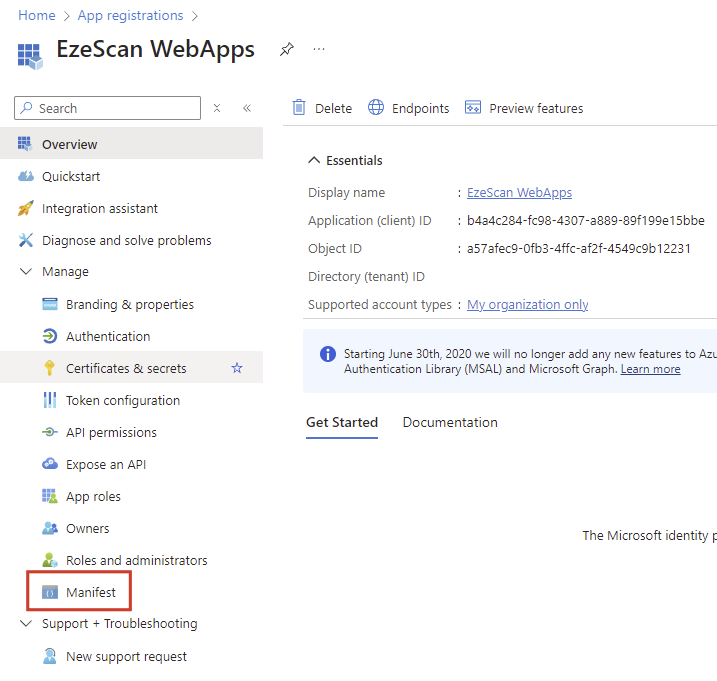 Navigate back to your App Registration and select the Manage > Manifest option on the left menu.