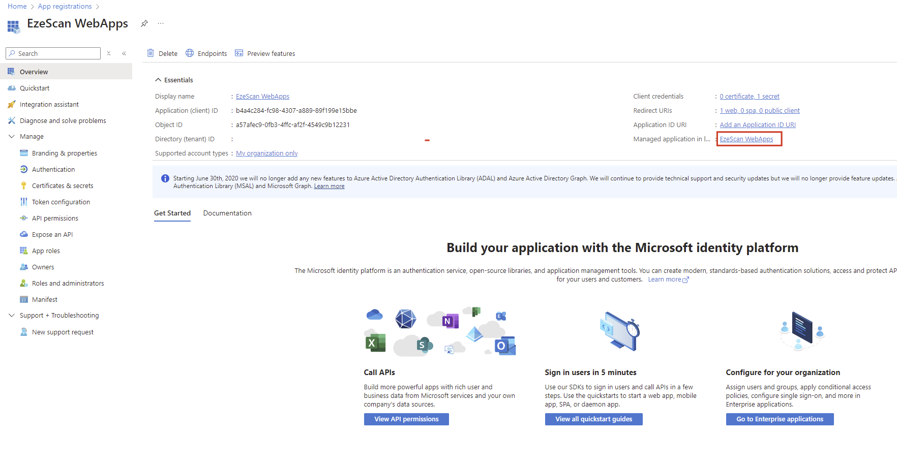 Open the existing app registration and then click the link next to the “Managed application in local directory” option.