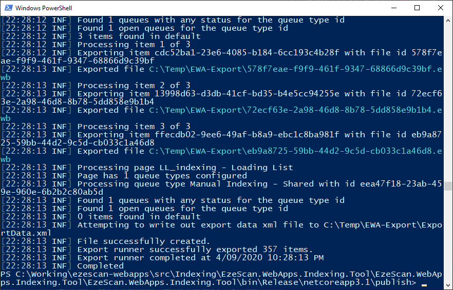 CODE.\EzeScan.WebApps.Indexing.Tool.exe export --ewa-dir "C:\EzeScanWebApps"- Confirm you see a success message at the end of the export. "Export runner successfully exported xxx items"